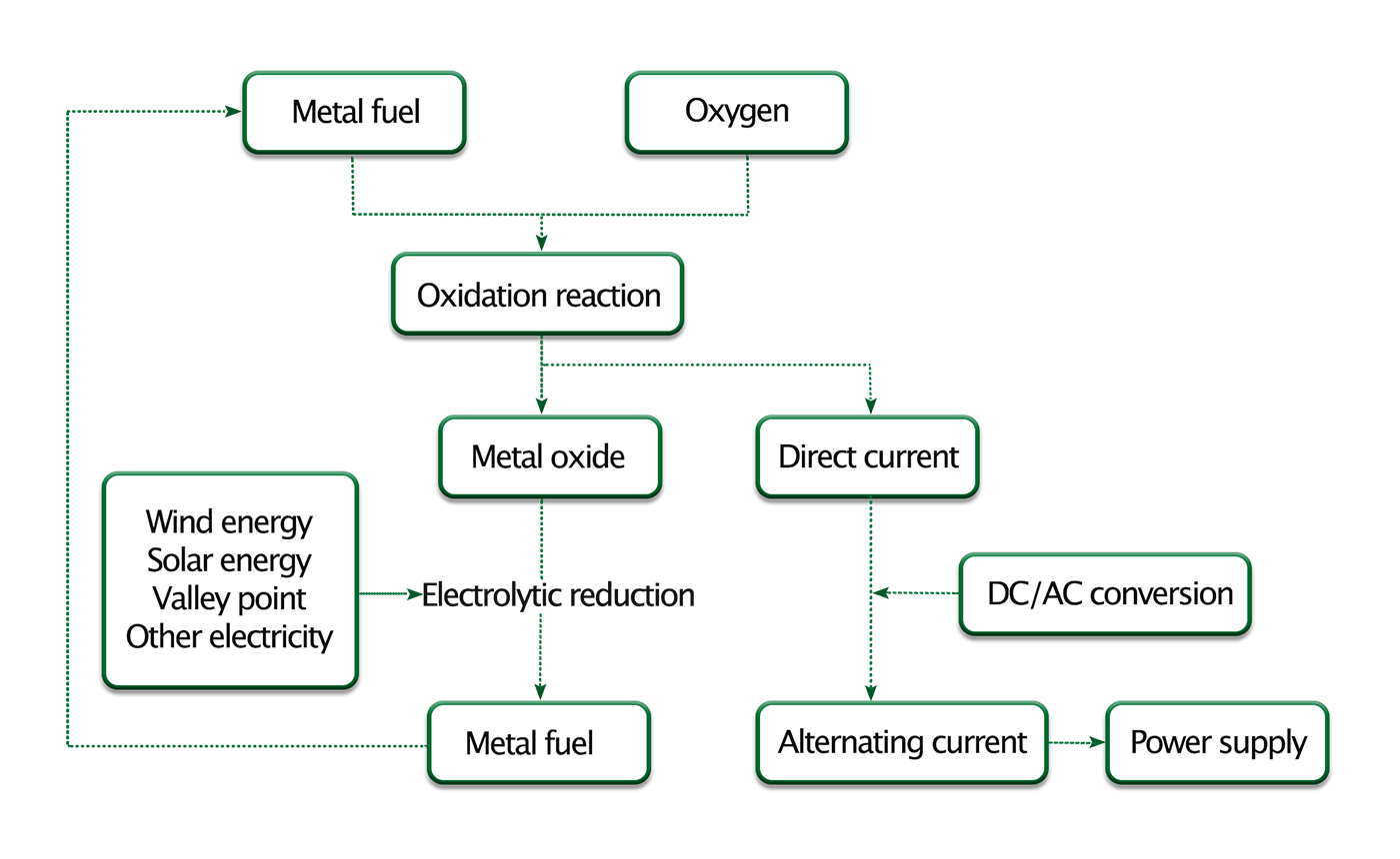 After the oxidation process, the zinc liquid fuel can then be converted back into its original chemical state through a reduction process, after the reduction process the fuel is cycled back through the oxidation process to generate power cleanly with no carbon emissions.
